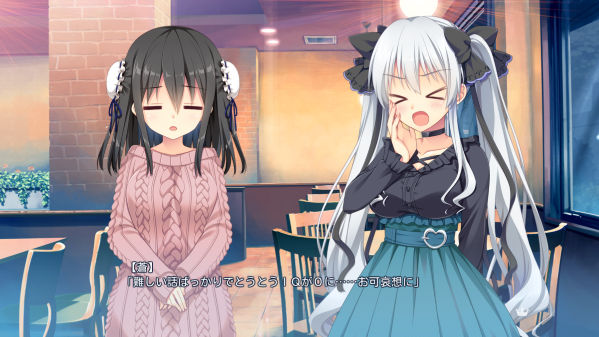 簡単なお話ばっかりでとうとうIQが0になってしまいました。ユーザーの需要を余すことなく綺麗に満たしていて非常に満足感の高い仕上がりになっている。……そう、ヴォリューム以外は! まぁ分かってたけどね! 前の作品未プレイだけどめっちゃ短いってみんな言ってたし。終わったときも