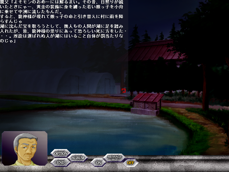 ただ、本当にそれは最序盤に限った話。私の場合結構早い段階で本作の纏う物語に引き込まれた。伝記モノ特有の異様さ、そういったものに対してどうしてという感情を向けるのは至って自然なことだが、本作も例に漏れず興味深い設定に関心を引き付けられてやまなかった。はじめはもっとも単純、主人公が来た村は現代とは思えないほど前時代的な価値観を持つ者たちがいた。しかしこれについては少し疑問が残るところがあった。文明の利器を恐れる素振りすら見せており、その時点では本当に文明から遠ざかった暮らしをしているのだなと思わせられたのだが、その後かなり現代的な田舎の商店街といった趣の建物の背景が表示された。一応シナリオ上は少し前(具体的にいつからだったかは忘れた)から外の人間が少し住んでいるという話ではあったので、もしかすると彼らがやったのかも……と思いつつも流石に商店街という規模は無理では……と、結局これについてはよくわかりませんでした。終わり。