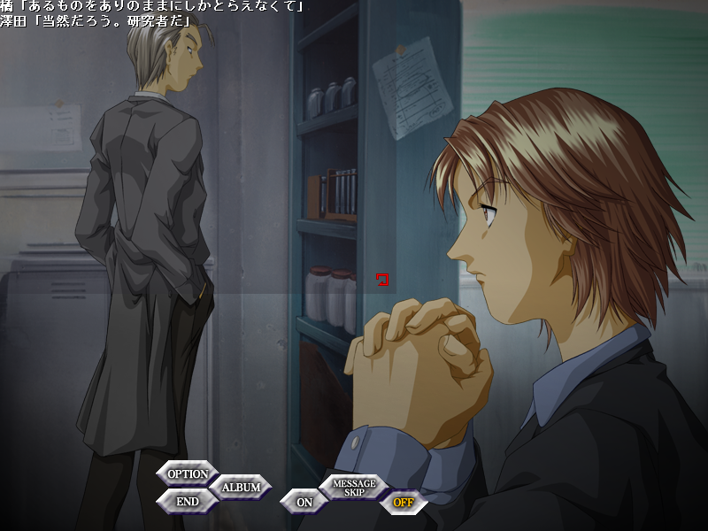 全体として、違和感を覚えるところは正直多かったものの、シナリオ自体かなり興味を惹かれるもので、実際期待には概ね応えてくれた。後半駆け足になっていたというのも理解できるし惜しい部分の一つだと思うが、ライターが本作において描きたかったもの自体は一応描き切れていたのではないかと思う。